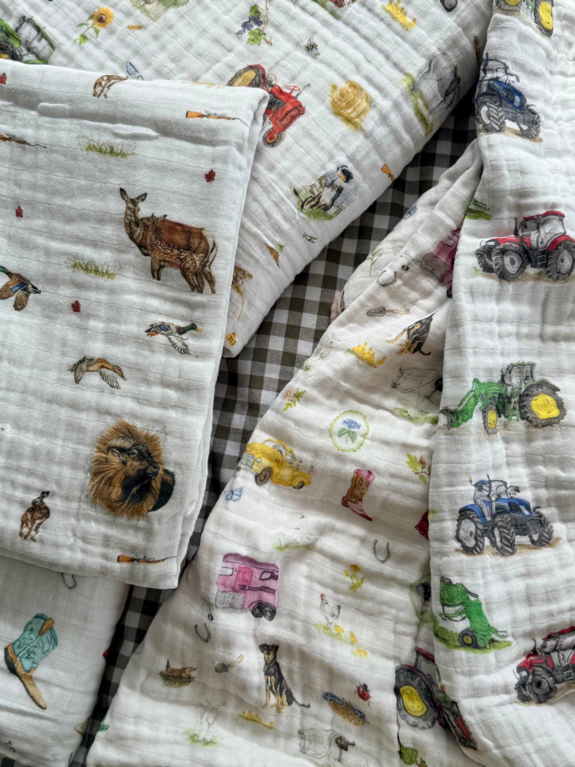Soft, breathable and beautifully unique, our 6-layer organic cotton muslin quilts are designed to wrap your little one in comfort and charm. Whether it’s for nap time, tummy time or cozy cuddles on the couch, each quilt showcases Madison’s original hand-painted artwork, turning an everyday essential into a piece of art to treasure.