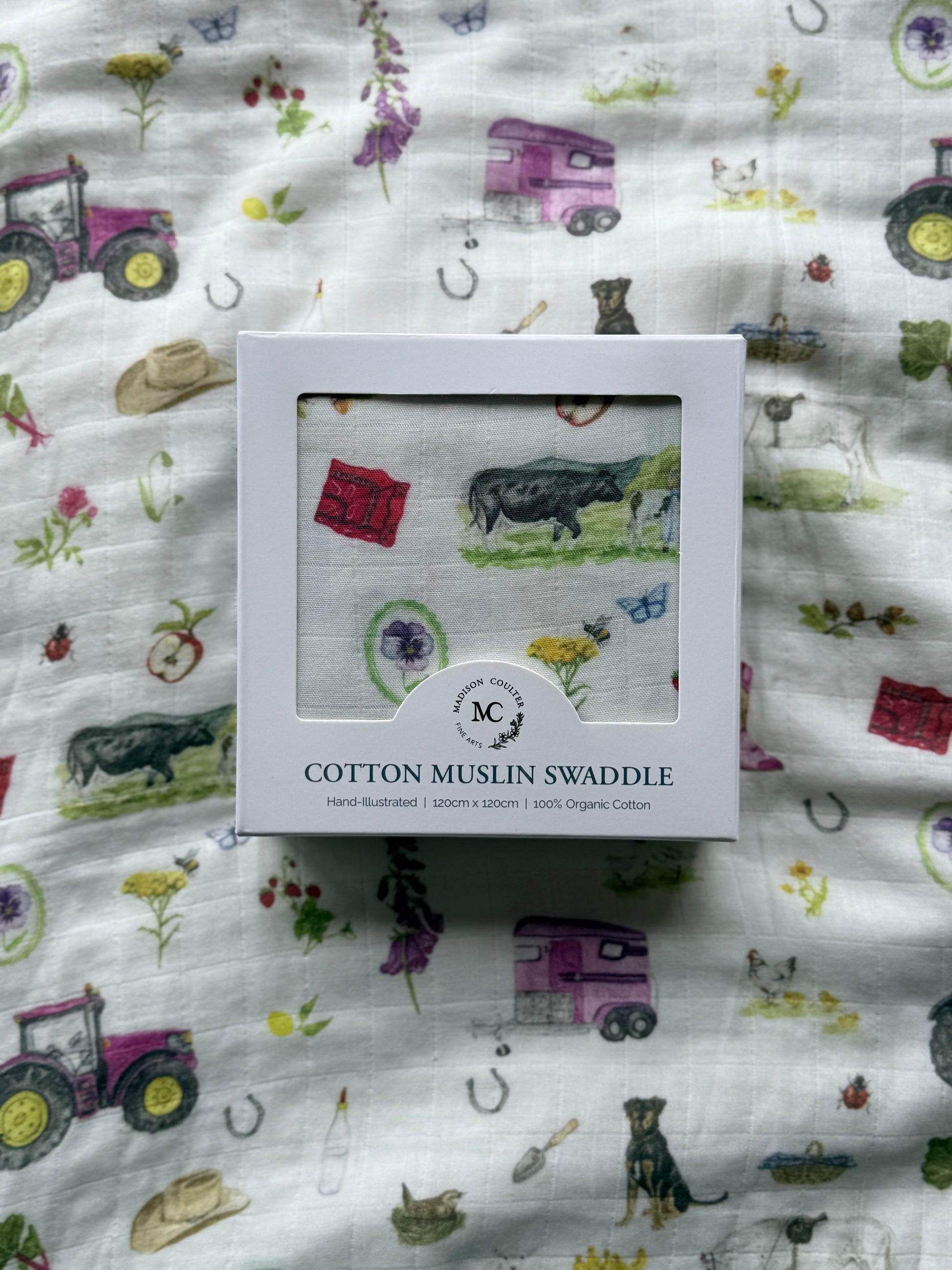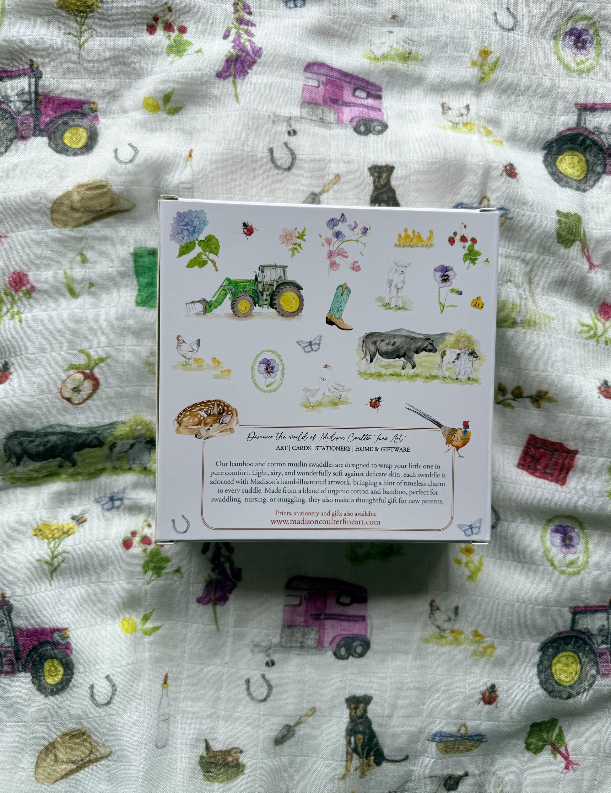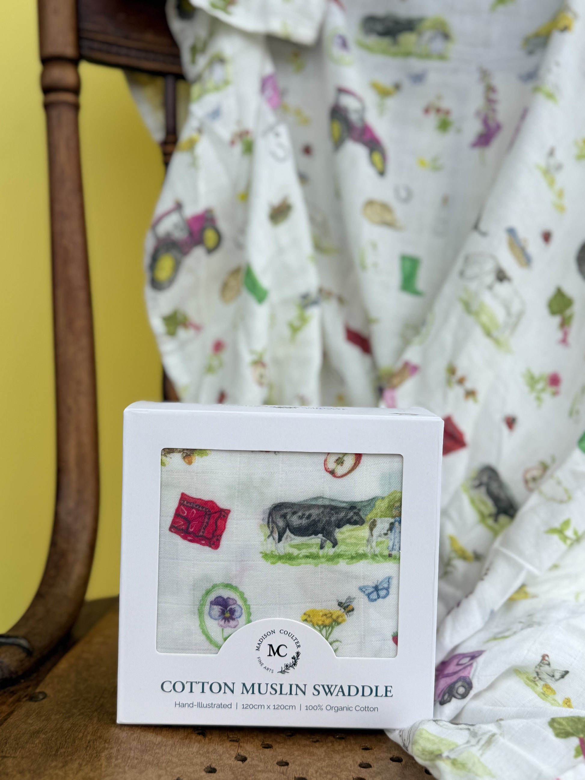 Our bamboo and cotton muslin swaddles are designed to wrap your little one in pure comfort. Light, airy, and wonderfully soft against delicate skin, each swaddle is adorned with Madison’s hand-illustrated artwork, bringing a hint of timeless charm to every cuddle. Made from a blend of organic cotton and bamboo, they’re perfect for swaddling, nursing, or snuggling, and make a beautiful gift for new arrivals and expecting parents alike.