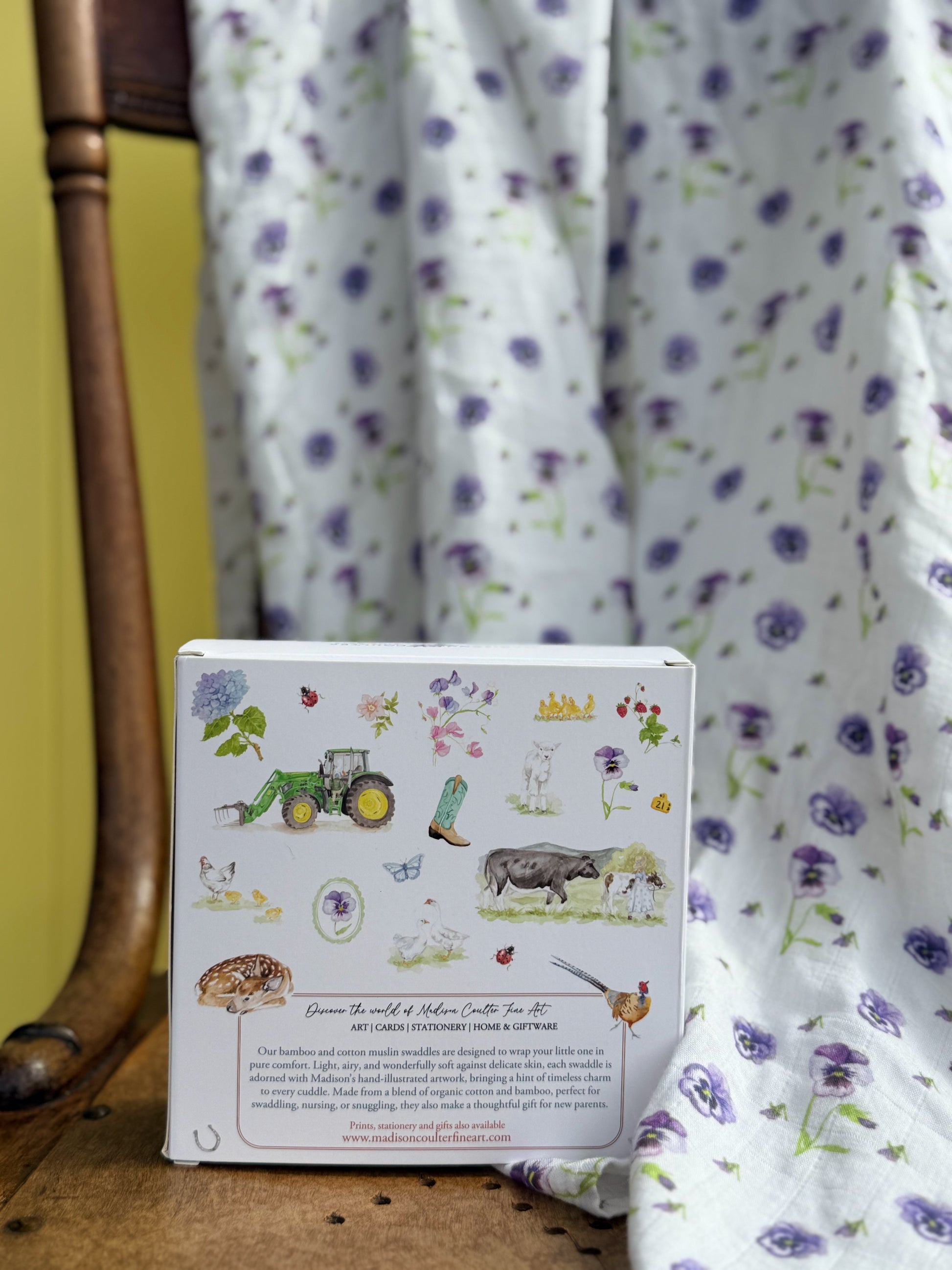 Our bamboo and cotton muslin swaddles are designed to wrap your little one in pure comfort. Light, airy, and wonderfully soft against delicate skin, each swaddle is adorned with Madison’s hand-illustrated artwork, bringing a hint of timeless charm to every cuddle. Made from a blend of organic cotton and bamboo, they’re perfect for swaddling, nursing, or snuggling, and make a beautiful gift for new arrivals and expecting parents alike.