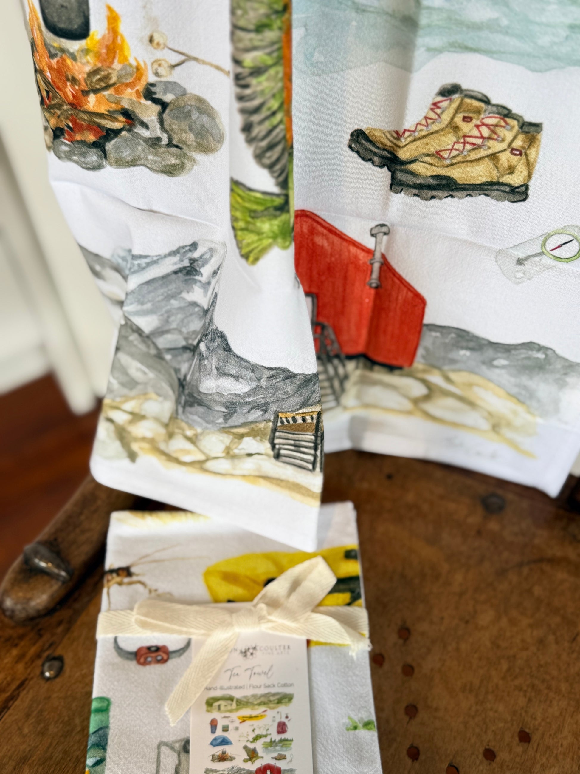 Bring the spirit of adventure into your kitchen with this carefully crafted montage of camping and wilderness items. From cozy tents and backpacks to campfires and forest landscapes, this print celebrates the joy of exploring the great outdoors. These tea towels are made from