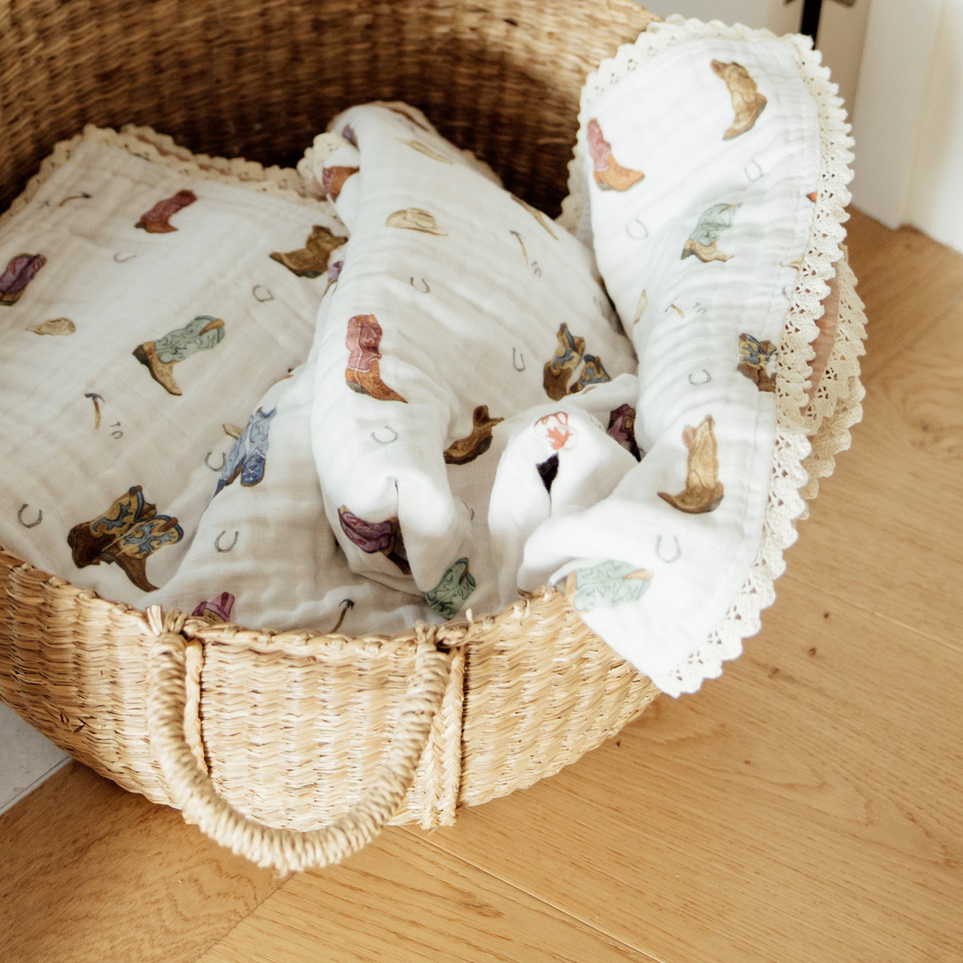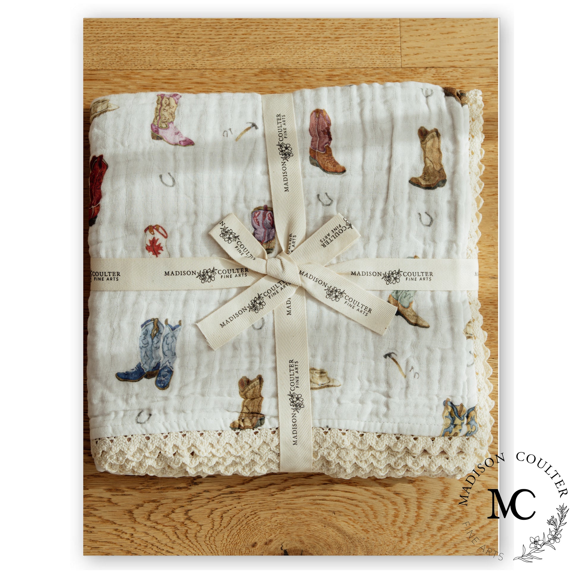 Soft, breathable and beautifully unique, our 6-layer organic cotton muslin quilts are designed to wrap your little one in comfort and charm. Whether it’s for nap time, tummy time or cozy cuddles on the couch, each quilt showcases Madison’s original hand-painted artwork, turning an everyday essential into a piece of art to treasure.