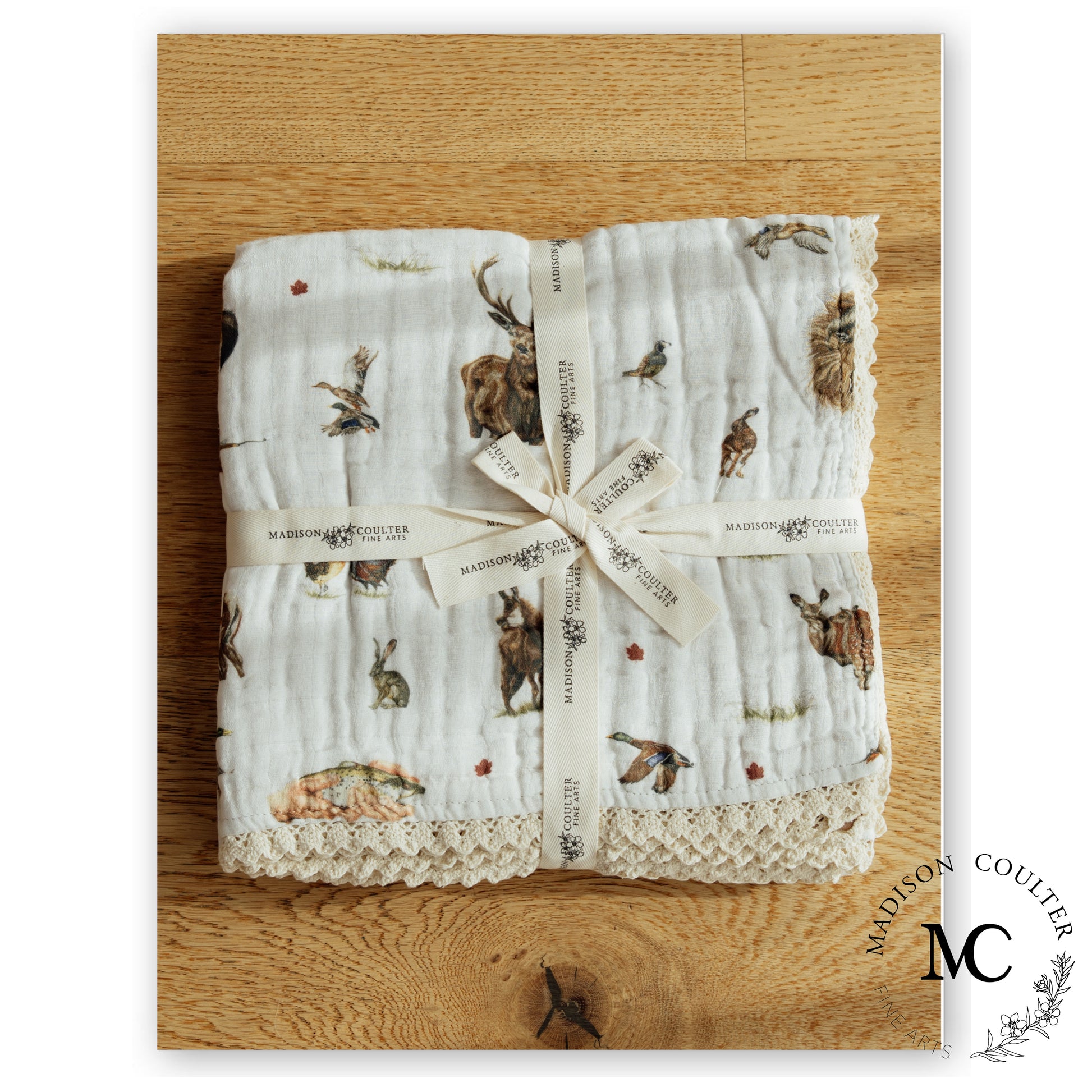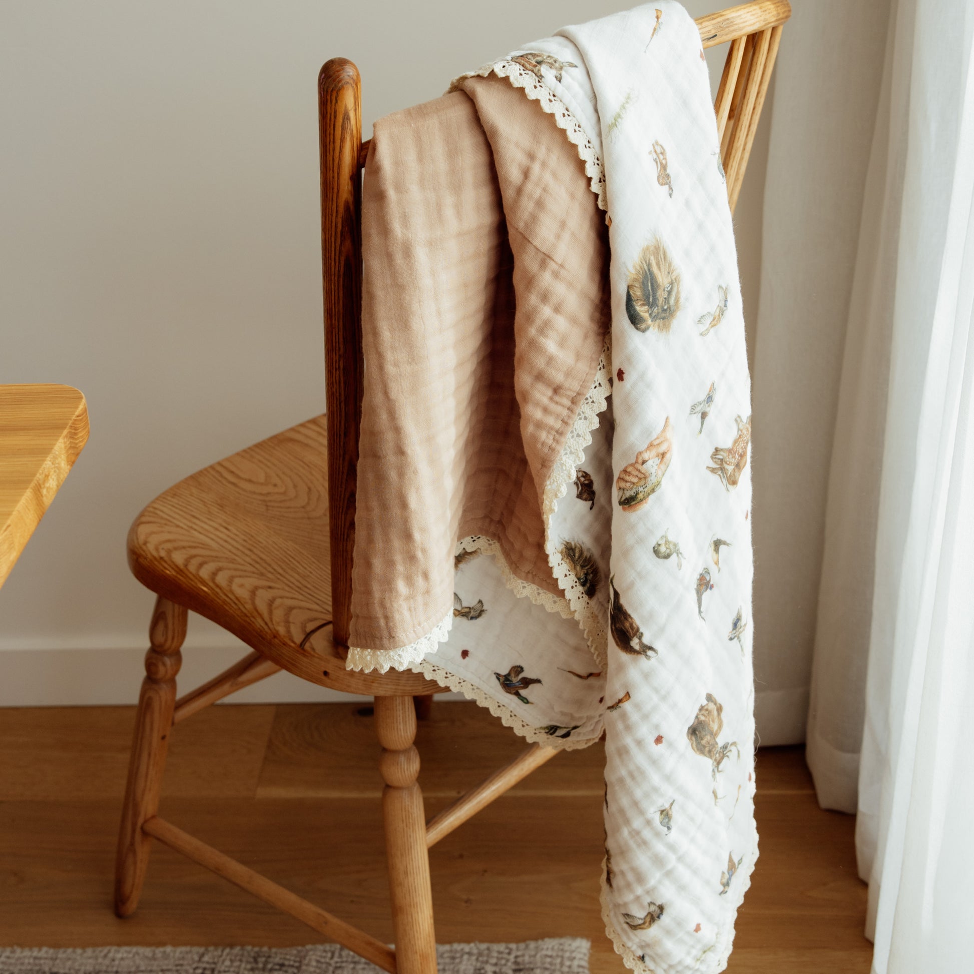 Soft, breathable and beautifully unique, our 6-layer organic cotton muslin quilts are designed to wrap your little one in comfort and charm. Whether it’s for nap time, tummy time or cozy cuddles on the couch, each quilt showcases Madison’s original hand-painted artwork, turning an everyday essential into a piece of art to treasure.