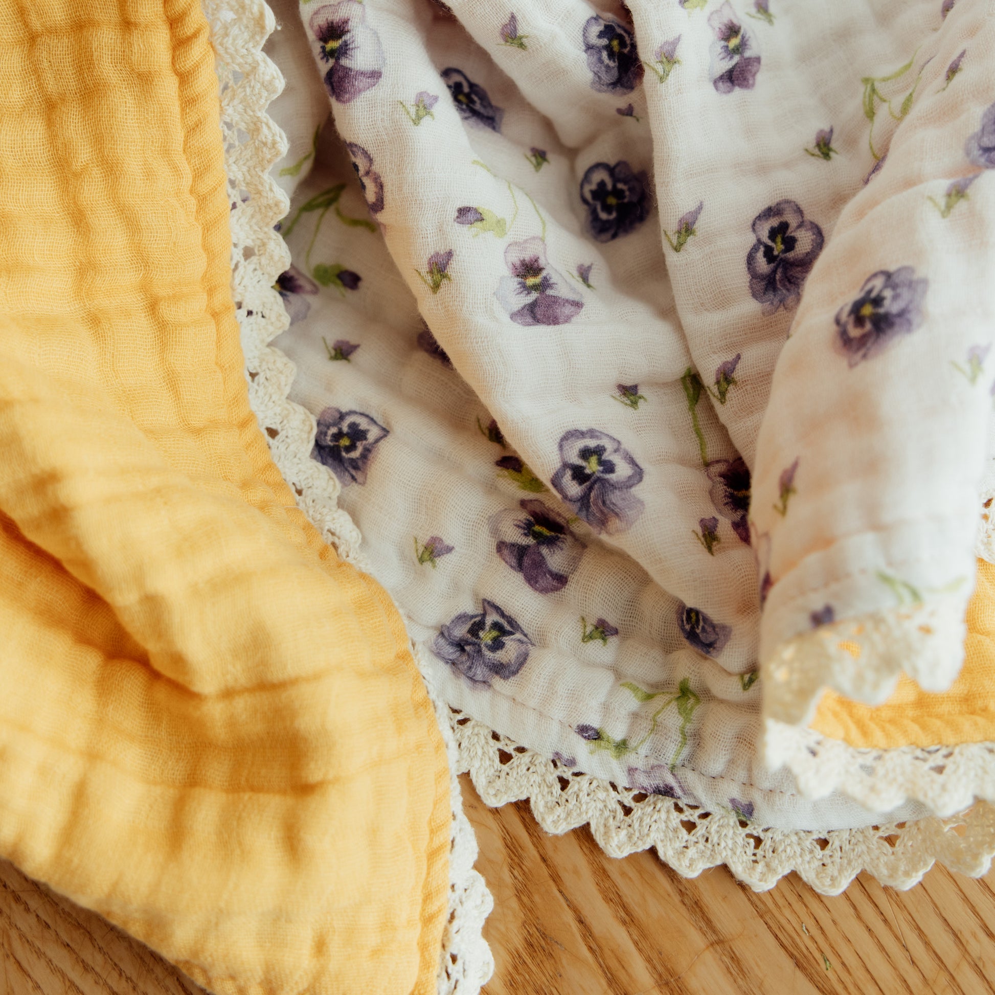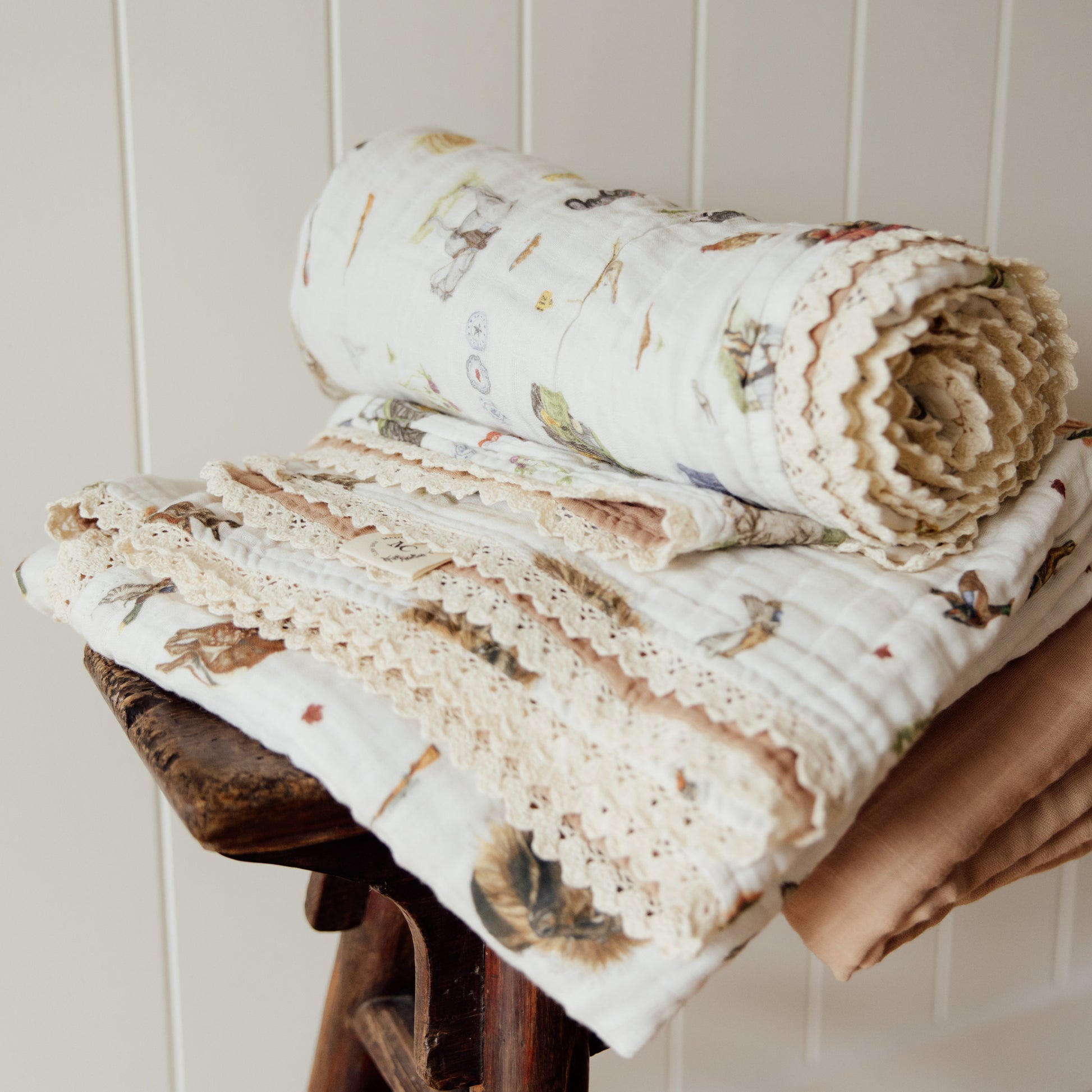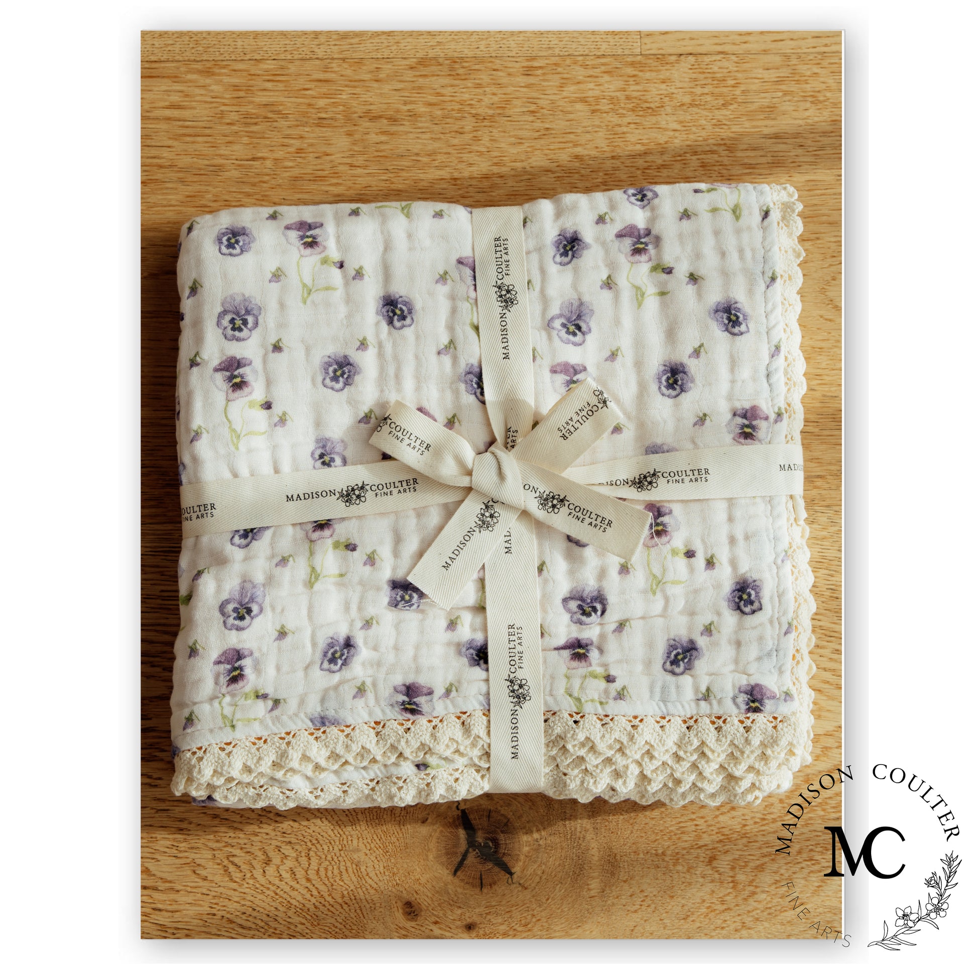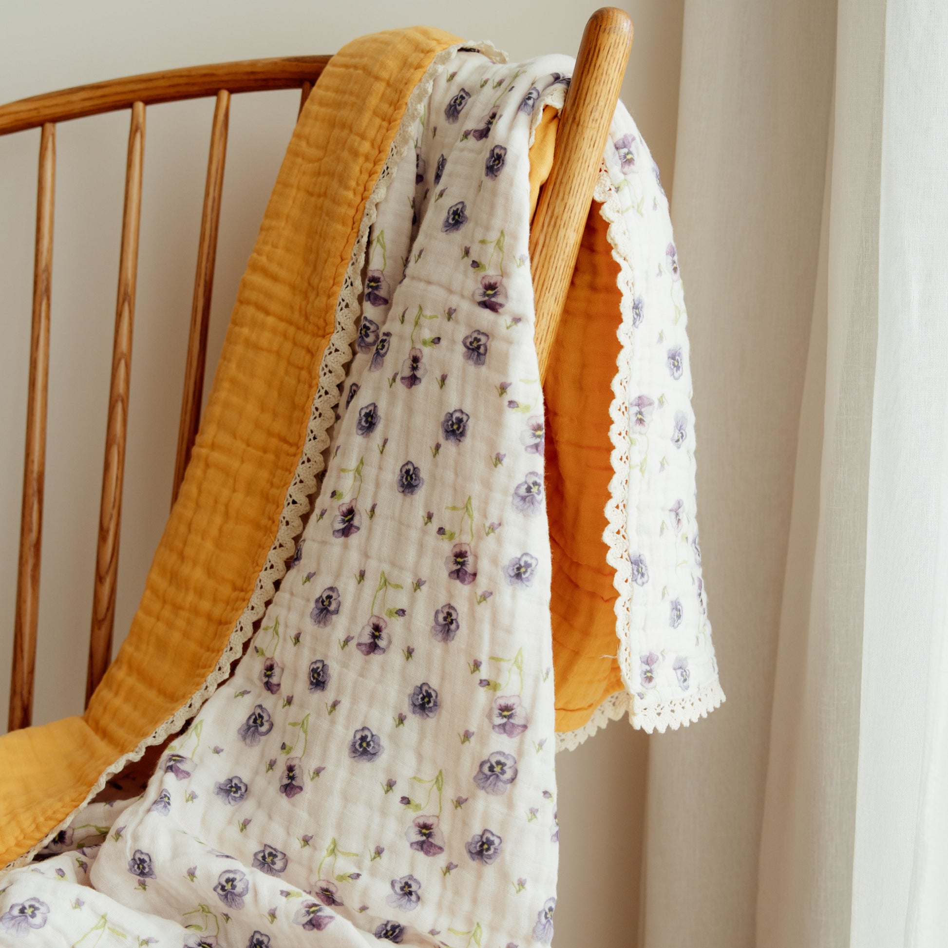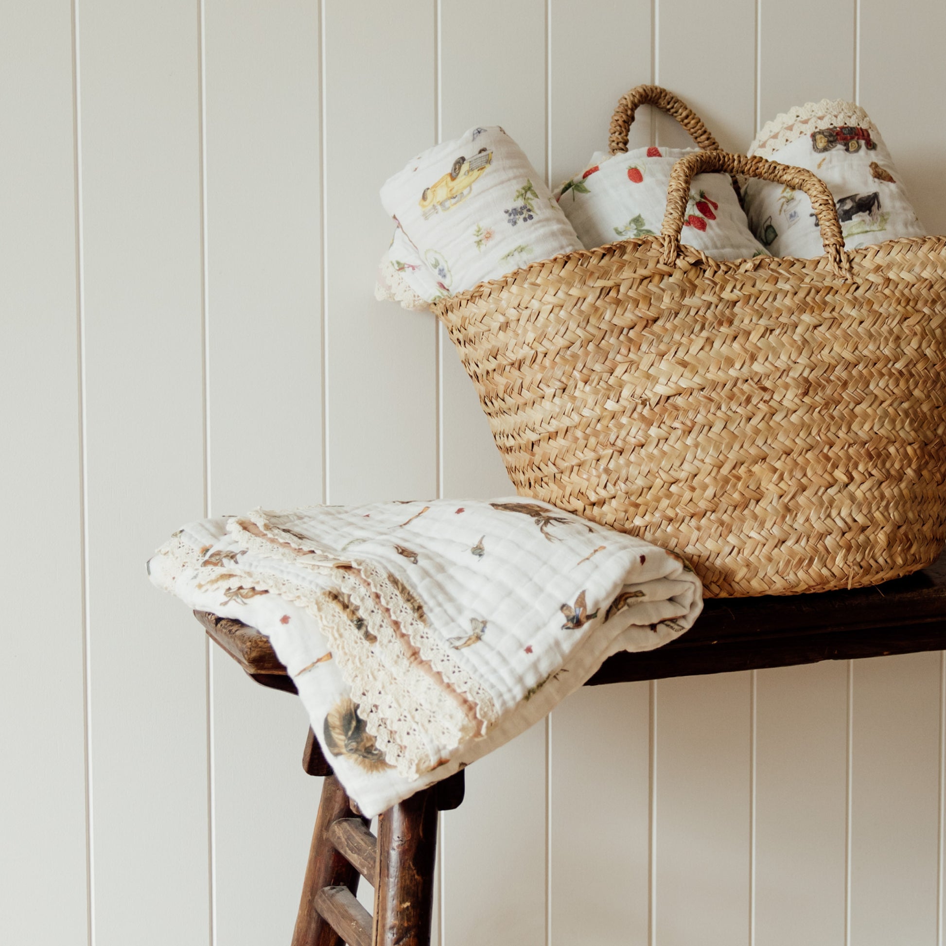 Soft, breathable and beautifully unique, our 6-layer organic cotton muslin quilts are designed to wrap your little one in comfort and charm. Whether it’s for nap time, tummy time or cozy cuddles on the couch, each quilt showcases Madison’s original hand-painted artwork, turning an everyday essential into a piece of art to treasure.