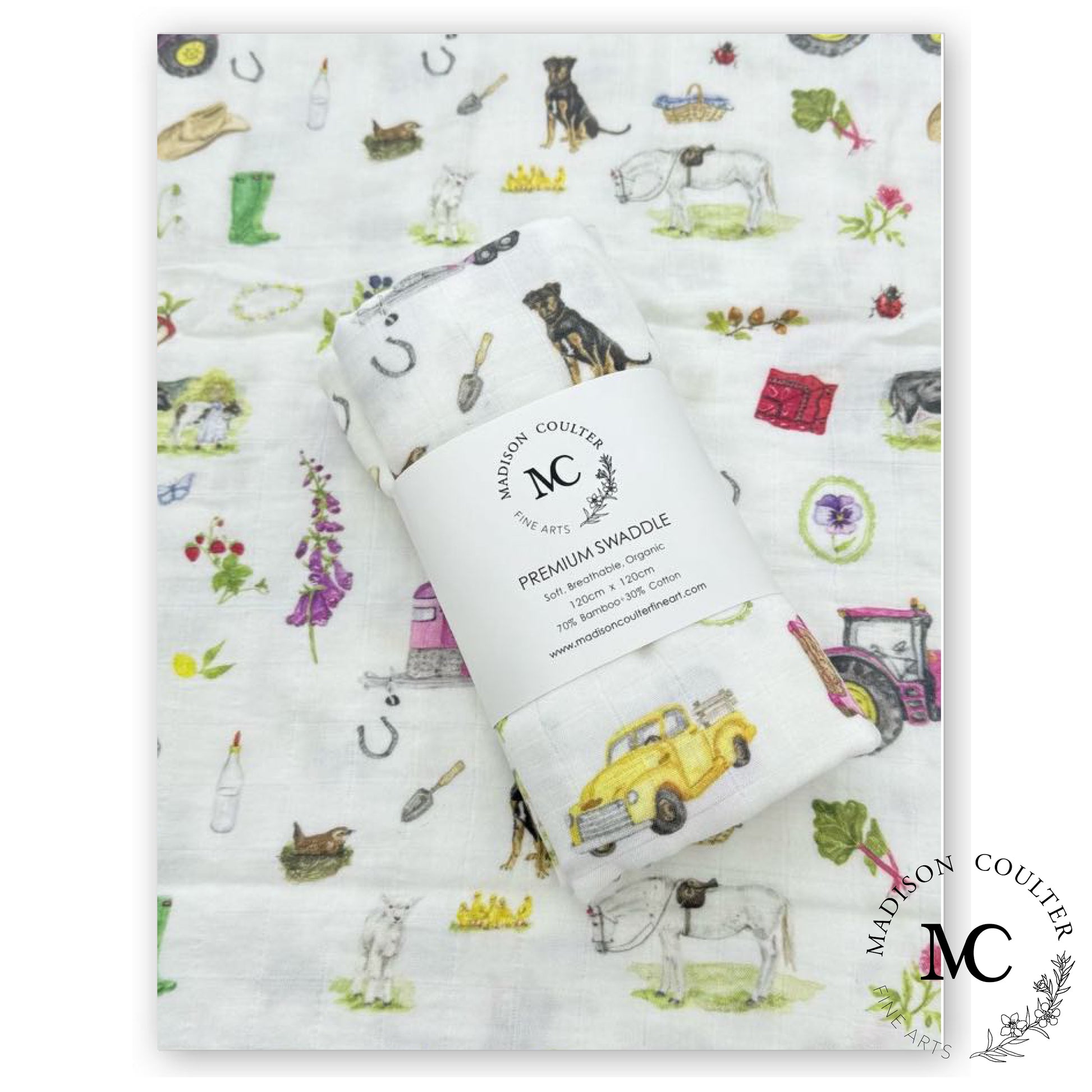 Our bamboo and cotton muslin swaddles are designed to wrap your little one in pure comfort. Light, airy, and wonderfully soft against delicate skin, each swaddle is adorned with Madison’s hand-illustrated artwork, bringing a hint of timeless charm to every cuddle. Made from a blend of organic cotton and bamboo, they’re perfect for swaddling, nursing, or snuggling, and make a beautiful gift for new arrivals and expecting parents alike.