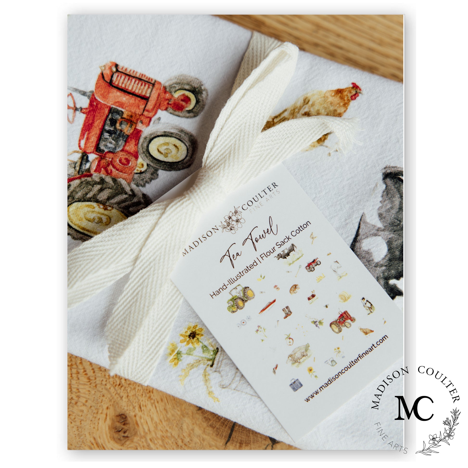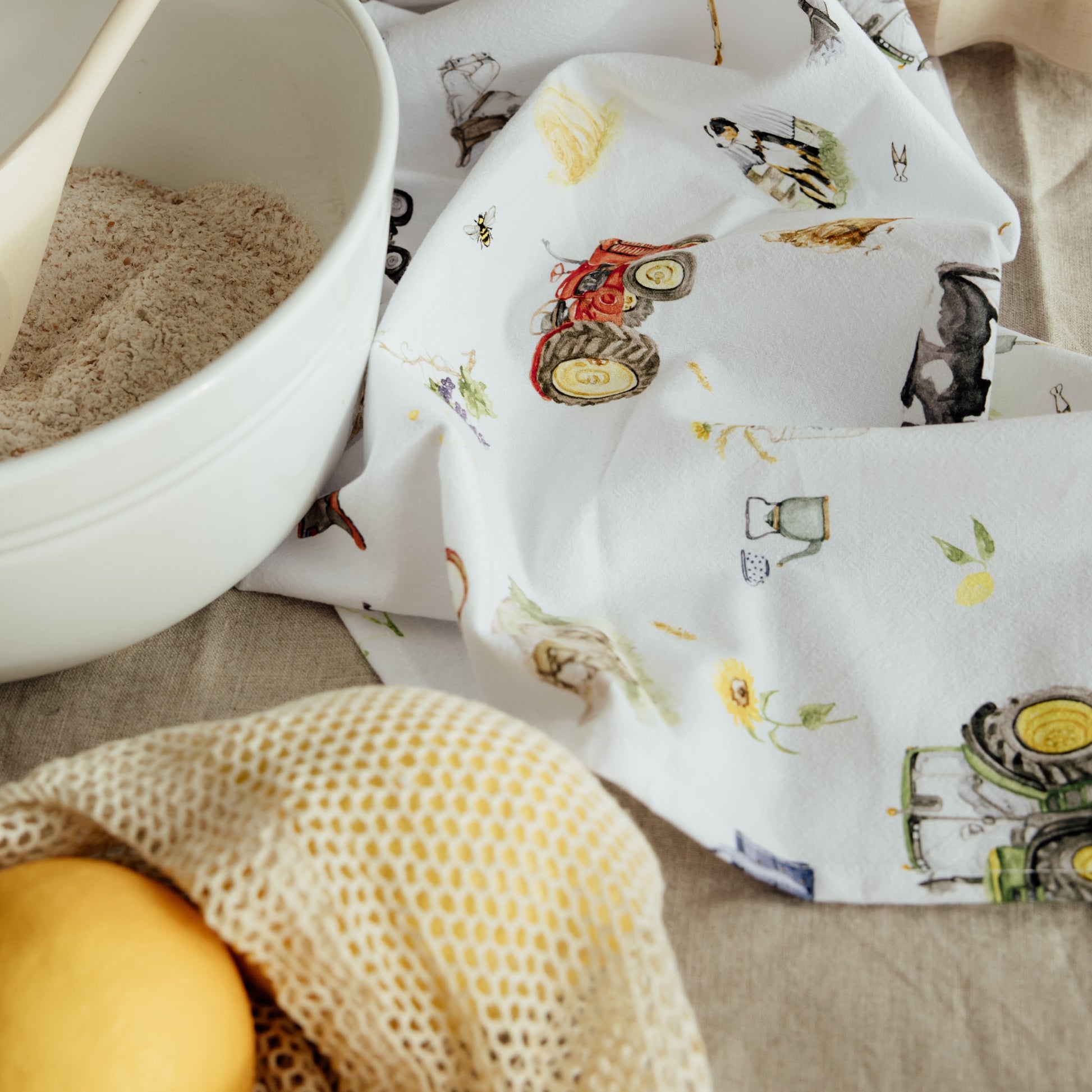 Featuring Madison’s hand- illustrated Farmer’s Collection, these tea towels are made from